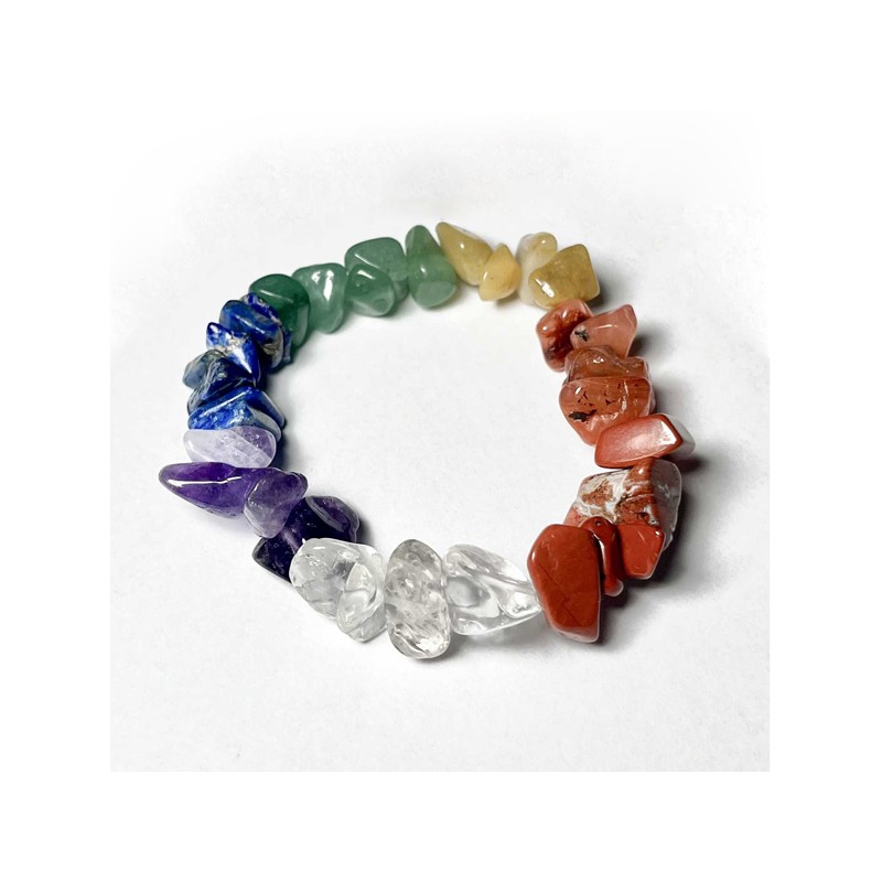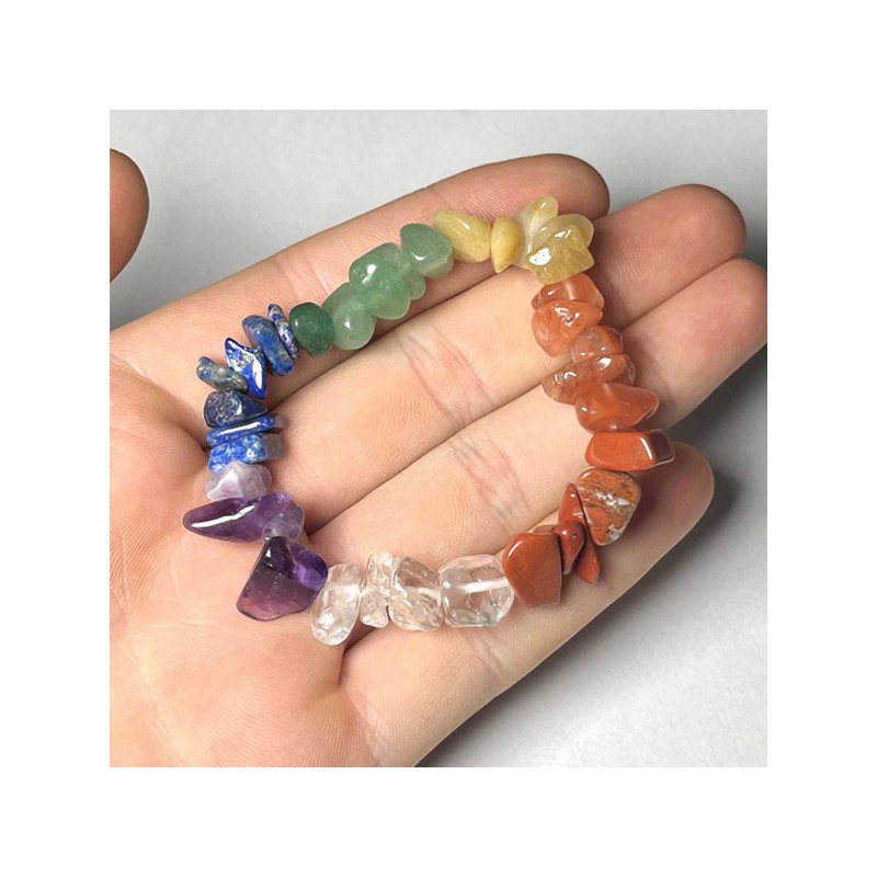 piedras semipreciosas, cada una asociada a uno de los siete chakras principales del cuerpo. Estas piedras han sido cuidadosamente pulidas en pequeñas piezas de chip, conservando sus propiedades energéticas y su belleza natural. El material es duradero y cómodo, perfecto para el uso diario. La calidad excepcional de las piedras garantiza una conexión profunda y duradera con la energía de los chakras, promoviendo un equilibrio y bienestar constante.