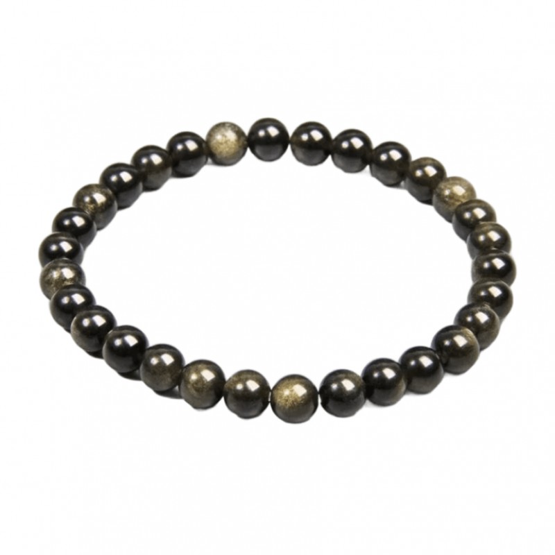 Pulsera elaborada con cuentas de Obsidiana Dorada natural de 8 mm, cuidadosamente pulidas para destacar sus destellos dorados sobre el negro volcánico profundo. Cada esfera combina fuerza visual con un acabado suave y elegante.
