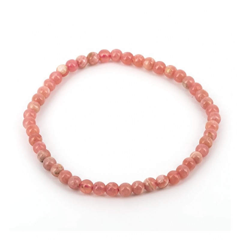 Pulsera elaborada con esferas de rodocrosita auténtica de 6 mm, pulidas con cuidado para destacar su característico tono rosado con vetas blancas y su suavidad al tacto. Montada en hilo elástico duradero, es ligera, cómoda y con un acabado delicado y elegante.